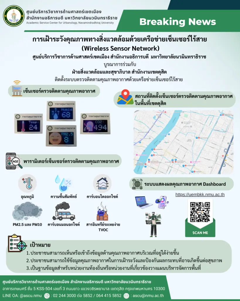 เคยสงสัยไหมว่าอากาศหน้าบ้านเราวันนี้ดีพอหรือยัง? 🏠 ตอนนี้ “ศูนย์บริการวิชาการด้านศาสตร์เขตเมือง มหาวิทยาลัยนวมินทราธิราช ร่วมกับ ฝ่ายสิ่งแวดล้อมและสุขาภิบาล สำนักงานเขตดุสิต” ติดตั้งระบบเซ็นเซอร์ไร้สาย เพื่อเฝ้าระวังคุณภาพอากาศแบบ Real-time ในพื้นที่วัด ศาลเจ้า และชุมชน ทั่วพื้นที่เขตดุสิตแล้วครับ! เราตรวจอะไรบ้าง? ✅ PM2.5 / PM10