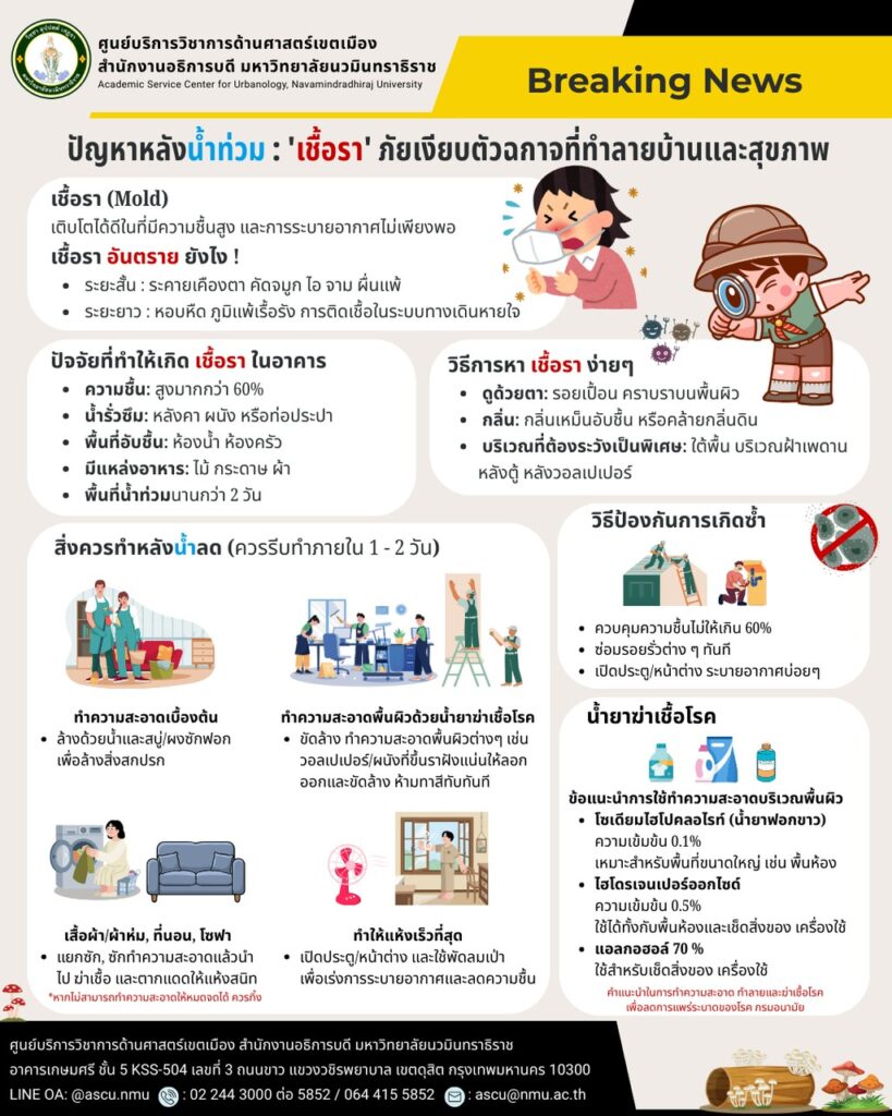 เชื้อรา เติบโตเร็วในที่ที่มีความชื้นสูง เสี่ยงต่อโรคทางเดินหายใจ สิ่งที่ต้องทำ(clipboard)โดยเร็วที่สุด ล้างทำความสะอาด สิ่งสกปรกที่มากับน้ำ ทำความสะอาด พื้นผิวต่างๆ ด้วยน้ำยาฆ่าเชื้อโรค เสื้อผ้าเฟอร์นิเจอร์ ซัก/ทำความสะอาด ฆ่าเชื้อแล้วตากแดดให้แห้งสนิท เปิดประตู/หน้าต่าง ระบายอากาศทำให้เเห้งเร็วที่สุด ควบคุมความชื้นไม่ให้เกิน 60% ป้องกันเกิดเชื้อราซ้ำ ปกป้องบ้านและสุขภาพคุณให้ปลอดภัยจากเชื้อรา