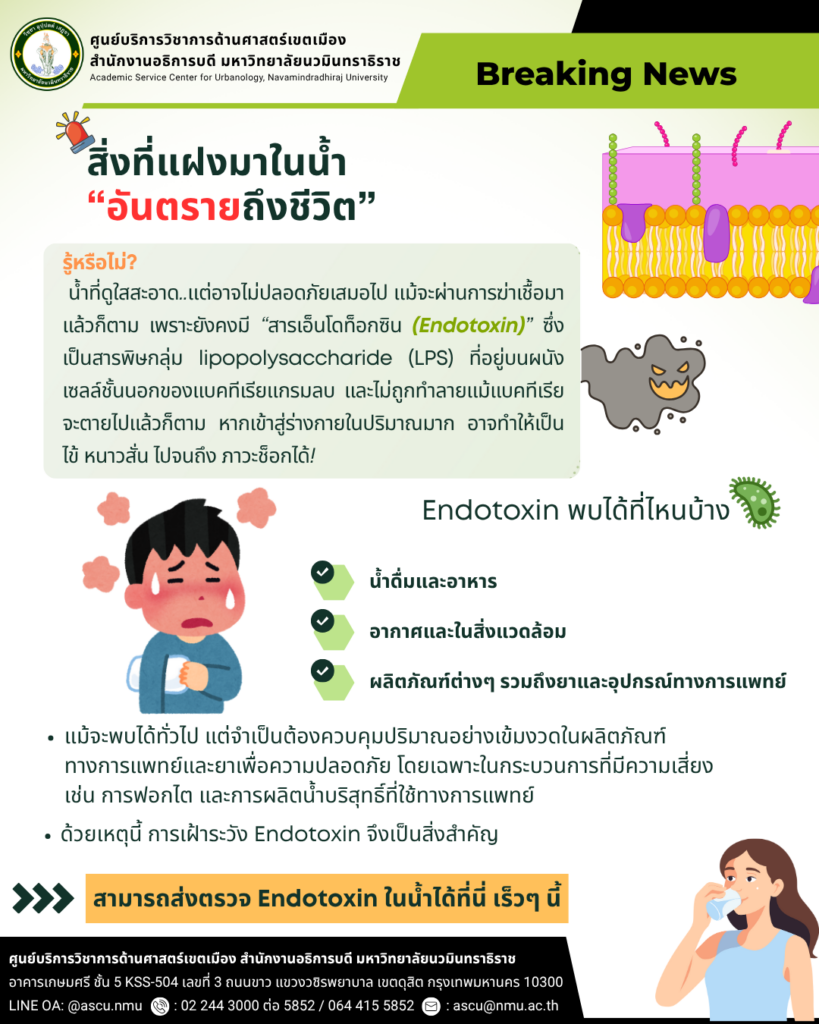 เราดื่มน้ำทุกวัน… แต่รู้หรือไม่? อาจมีสารพิษซ่อนอยู่ แม้จะผ่านการฆ่าเชื้อแล้วก็ตาม! 🦠 สารพิษนี้คือ Endotoxin ที่มาจากแบคทีเรียบางชนิด ถึงแม้แบคทีเรียจะตายไปแล้ว สารพิษก็ยังคงอยู่ และอาจก่อให้เกิด ไข้ 🤒 หนาวสั่น ❄️ ภาวะช็อก ⚠️ 💧 น้ำดื่มทั่วไปที่ได้มาตรฐาน ความเสี่ยงถือว่าต่ำ